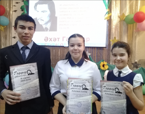 "Гаффар дәвамчылары" бәйгесенең финалы Халыкара туган телләр көне алдыннан бәйрәм өстенә бәйрәм булды. Әхәт Гаффарның үзе һәм башка якташ язучыларыбыз белән очрашу бәйгедә катнашкан укучыларыбыз күңеленә онытылмаслык бер хәтирә булып кереп калды. Гөлфинә һәм Азалиябез Рәхмәт хаты белән бүләкләнсә, Булатыбыз II дәрәҗә Дипломга лаек булды. Бу укучыларга тагын да иҗади уңышлар телибез.
