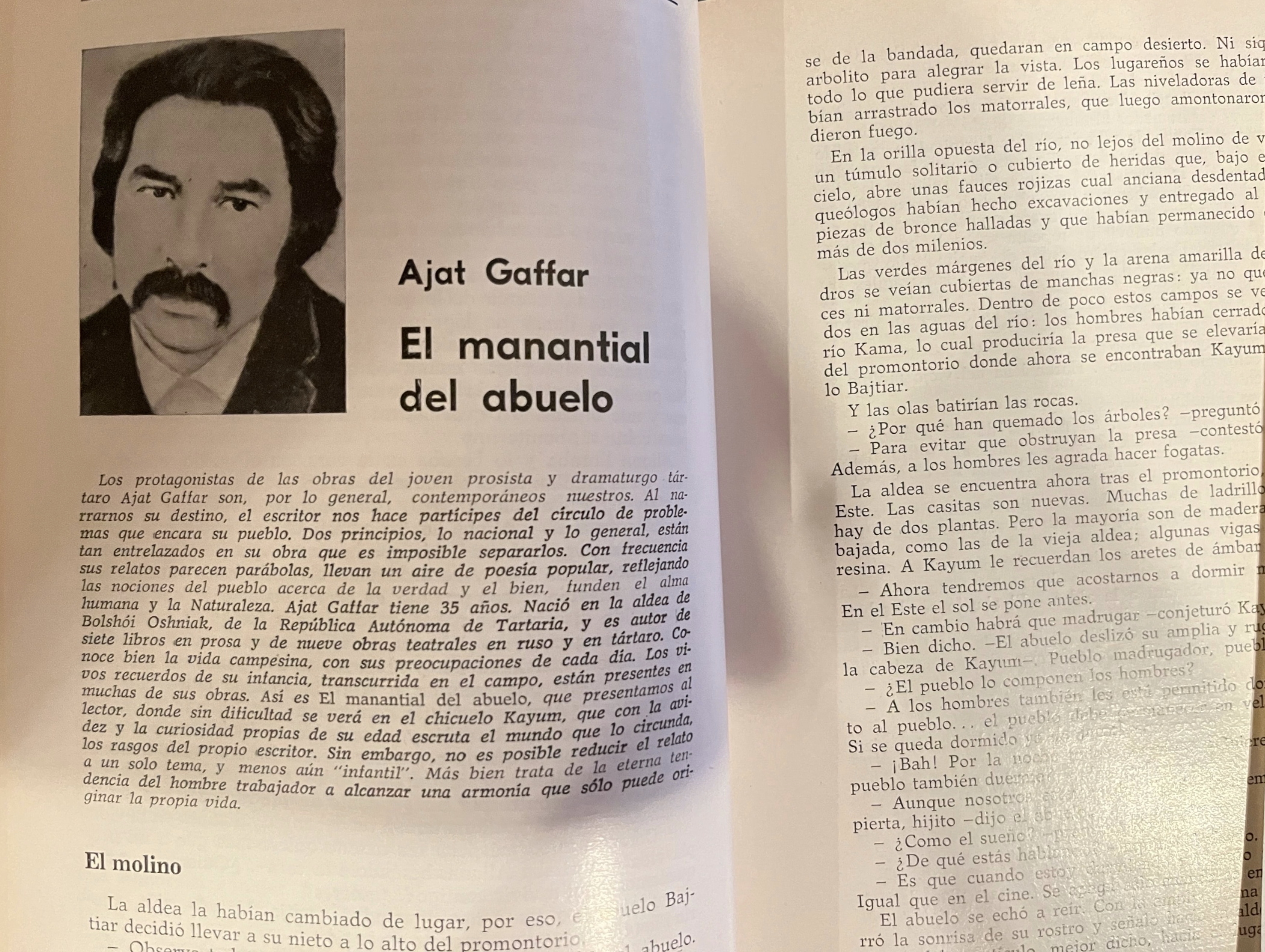 "Советская литература" журналы, 1984, испан телендә. Биредә Әхәт Гаффарның "Бабай чишмәсе" әсәре басылып чыккан.