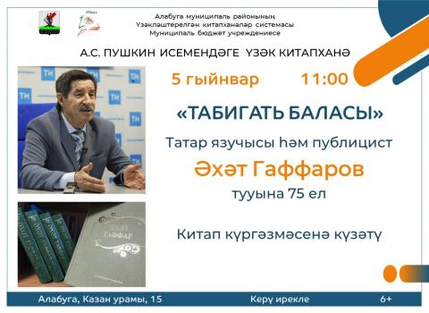 5 нче гыйнвар көнне А.С. Пушкин исемендәге Алабуга Үзәк китапханәсенең татар һәм туган як турындагы әдәбият бүлегендә китап күргәзмәсе оештырылды. Ул язучы һәм публицист Әхәт Гаффарга 75 ел тулуга багышланды. Әхәт ага күренекле язучы, драматург, публицист, тәнкыйтьче, шагыйрь, әдәби журналист. Аның «Әҗәт», «Язлар моңы», «Энә күзе», «Богау», «Дәрья башы», «Яшиселәр алда иде» кебек дистәләгән роман һәм повестьлары укучылар тарафыннан яратып укыла. Өстәвенә, ул – әкиятче дә. «Юынмый торган балык», «Мунча яратучы бака», «Суалчан кунакка бара» әкиятләре балаларга бик таныш.
