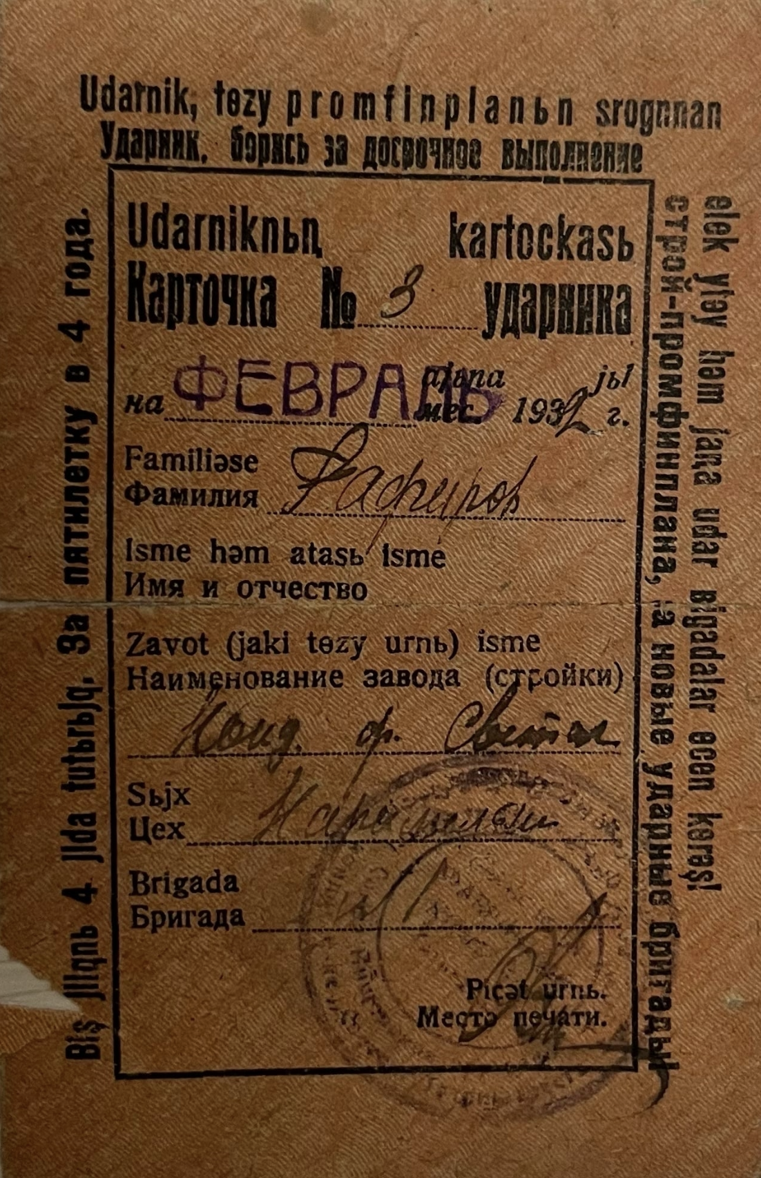 Әхәт Гаффарның әтисе Габдрахманның ударник карточкасы