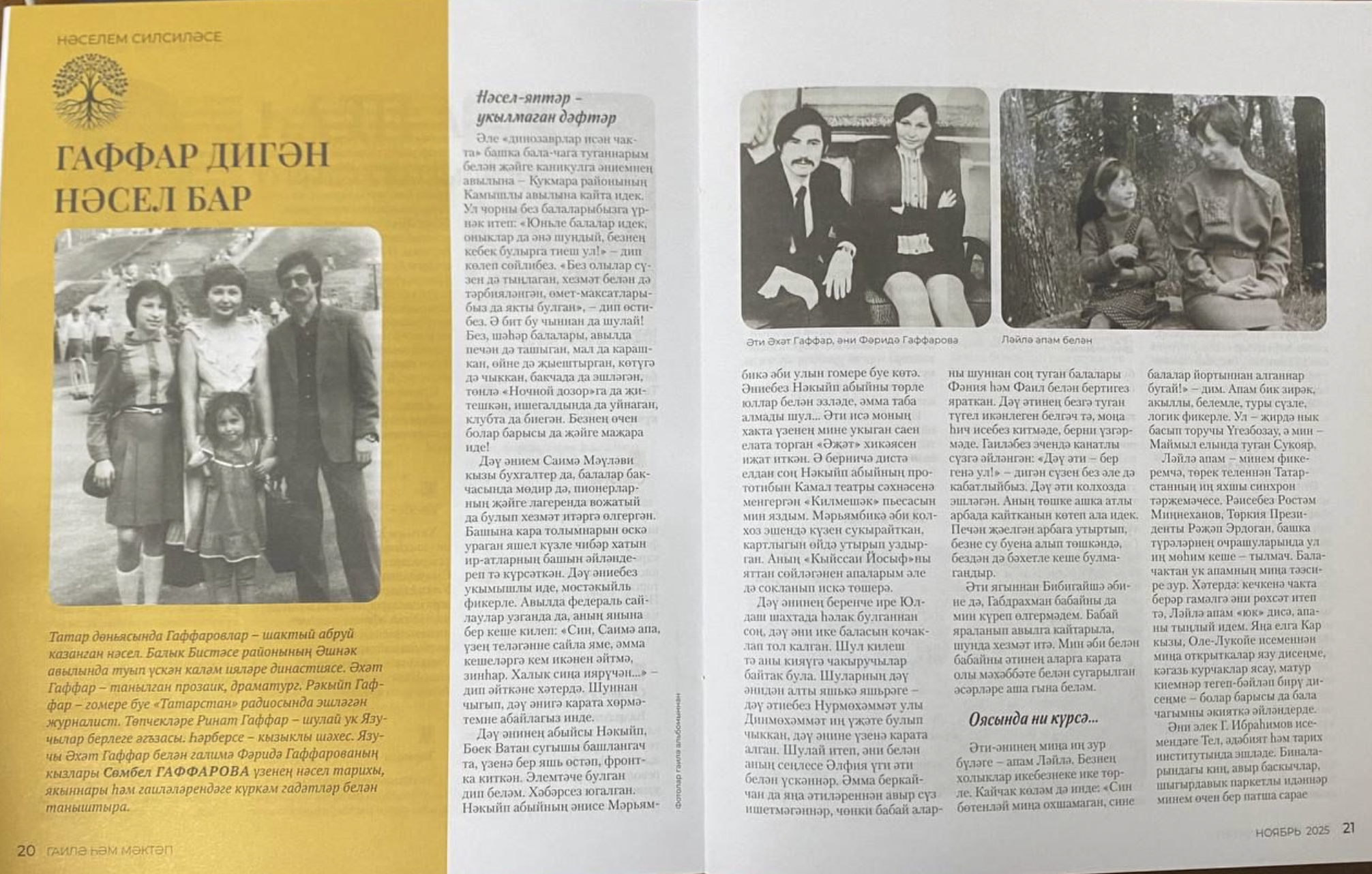Татар дөньясында Гаффаровлар - шактый абруй казанган нәсел. Балык Бистәсе районының Әшнәк авылында туып үскән каләм ияләре династиясе. Әхәт Гаффар - танылган прозаик, драматург. Рәкыйп Гаффар - гомере буе “Татарстан” радиосында эшләгән журналист. Төпчекләре Ринат Гаффар исә, шулай ук язучылар берлеге әгъзасы. Һәрберсе – кызыклы шәхес. Язучы Әхәт Гаффар белән галим Фәридә Гаффарованың кызлары Сөмбел Гаффарова үзенең нәсел тарихы, якыннары һәм гаиләләрендәге күркәм гадәтләр белән таныштыра.