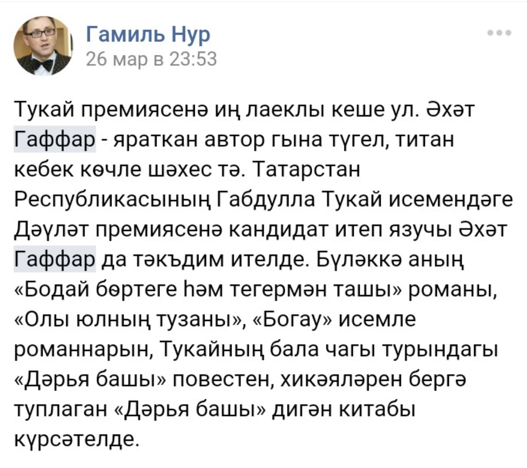 Татарстанның халык язучысы Марсель Галиев: Әхәт Гаффарга нәкъ менә Тукай премиясе җитми. Ул бу югары бүләккә лаек.